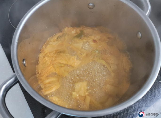 2. 달군 냄비에 들기름 1큰술을 두르고 썰어 놓은 김치를 볶다가 물 1200g을 붓고 끓여줍니다.