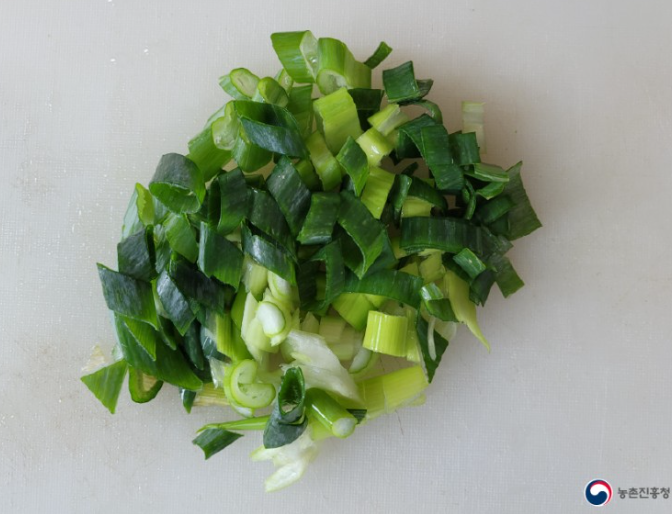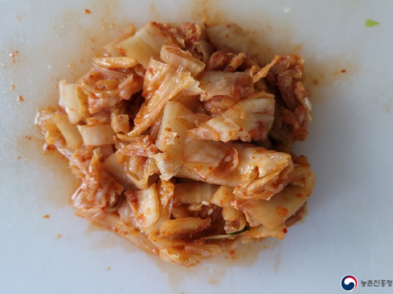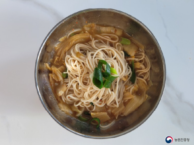 소면 200g, 김치(잘 익거나 신 것) 180g, 고소애 분말 10g(1.5큰술), 대파 20g(2/3 뿌리), 다진 마늘 5g(1작은술), 고춧가루 7g, (1큰술), 소금 2g(0.5작은술), 후추 1g(1/3작은술), 들기름 14g(1큰술)