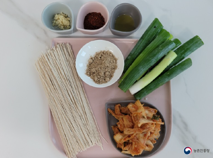 소면 200g, 김치(잘 익거나 신 것) 180g, 고소애 분말 10g(1.5큰술), 대파 20g(2/3 뿌리), 다진 마늘 5g(1작은술), 고춧가루 7g, (1큰술), 소금 2g(0.5작은술), 후추 1g(1/3작은술), 들기름 14g(1큰술)
