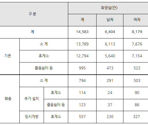 고속도로 휴게소 화장실이 기존 13,789칸이었으나 5.8% 증가하여 14,583칸으로 늘어났습니다.