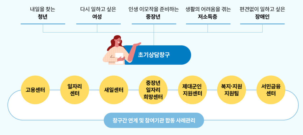 고용복지플러스센터를 처음 방문하면 초기 상담을 받을 수 있다고 합니다. 그곳에서 받을 서비스 경로가 설정되고 해당 창구에서 상담을 받다가 다른 기관의 상담을 받을 필요가 있으면 해당 기관의 창구로 연계되어 서비스를 받을 수 있다고 합니다.