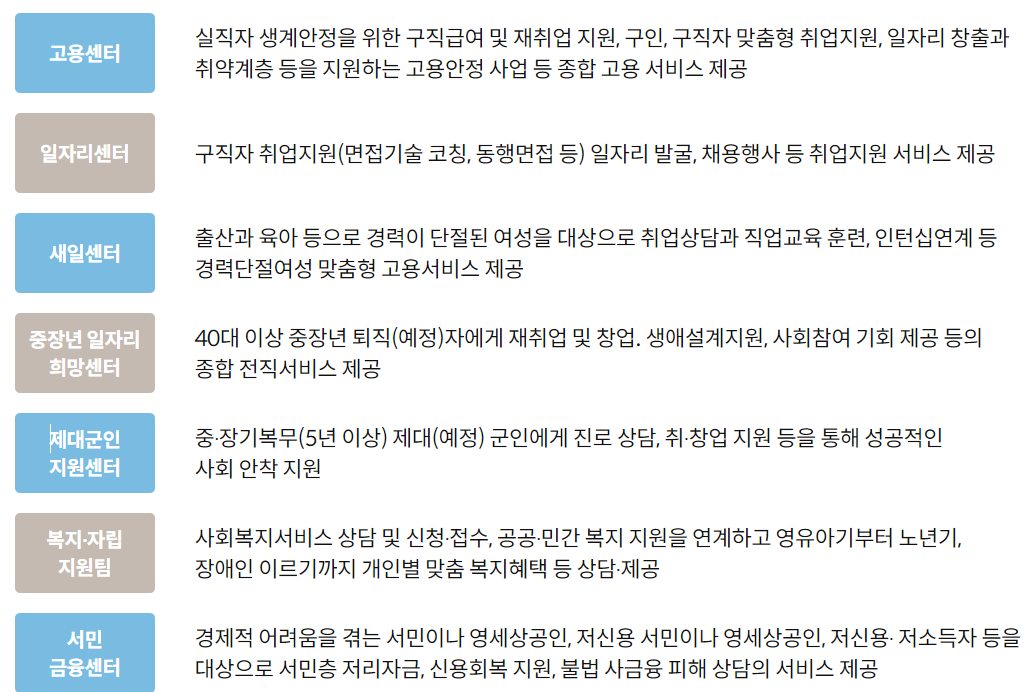 국민들이 쉽고 편하게 필요한 도움을 받을 수 있도록 <고용>, <복지>, <서민금융> 서비스를 한곳에서 One-stop 으로 지원하는 협업모델입니다.