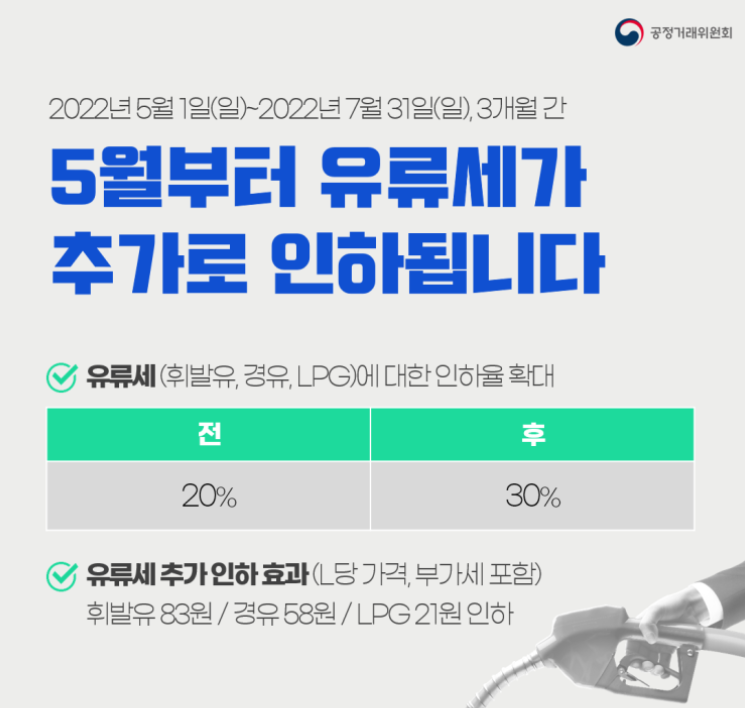 이번 유류세 인하는 기존 20%에서 10% 포인트를 추가한 30%로 확대해 오는 5월부터 7월까지 3개월간 시행할 방침입니다.