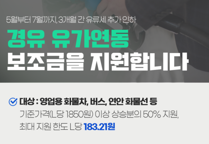 또한, 정부에서는 경유 가격 급등으로 어려움을 겪는 대중교통·물류 업계의 부담을 경감하기 위해 영업용 화물차, 버스, 연안 화물선 등에 대한 경우 유가연동 보조금을 3개월간 한시적으로 지급한다고 합니다.