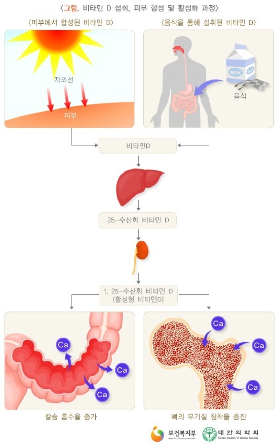 비타민D는 식이를 통한 섭취와 자외선에 의한 피부 합성을 통해 체내로 공급되며 간과 신장을 거치면서 활성형 비타민D가 되어 장에서 칼슘의 흡수를 증가시키고 뼈의 무기질 침착에 중요한 역할을 한다고 합니다.