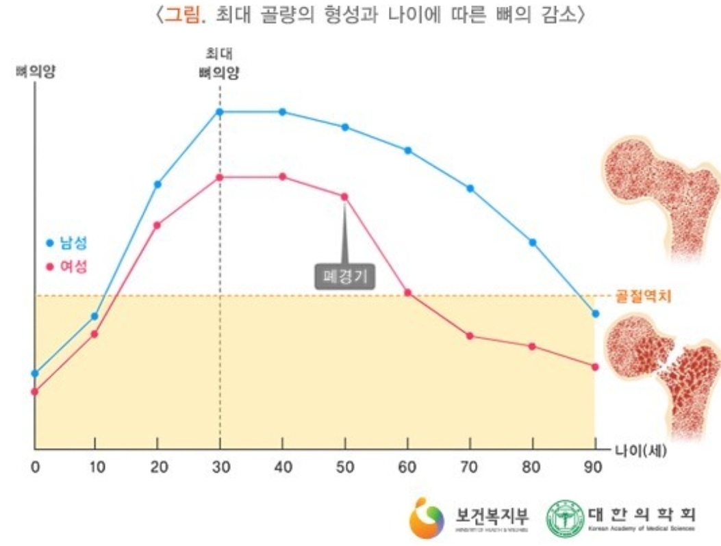 20대에서 30대까지 골밀도가 가장 높고 그 이후로는 조금씩 감소하다가 여성의 경우 폐경 첫 5년간 급속도로 골밀도가 약해진다고 합니다.