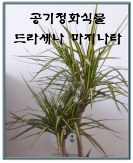 드라세나 마지나타는 우리나라에 1960년대부터 들어와서 실내식물로 많이 알려져있다고 합니다. 잎 모양은 창처럼 가느다랗고 잎 길이는 60CM 내외이고, 야자수 잎처럼 뭉쳐나는 아름다운 잎들은 미술관, 관공서, 호텔, 쇼핑몰, 고급 레스토랑의 입구에서 우아한 자태를 뽐내고 있다고 합니다. 뿌리가 화분구멍으로 나오는 경우 흙이 굳어져서 물 흡수가 제대로 되지 않는 경우나, 뿌리가 썩어 식물 아랫부분 잎이 시드는 경우, 분갈이를 해주는 것이 좋고, 봄 4월에서 6월, 겨울 9월에서 10월 사이에 하는 것이 좋다고 합니다. 드라세나 마지나타는 자일렌과 트리클로로에틸렌 등 실내 독성물질 제거 능력이 우수해 공기청정기 역할을 톡톡히 해내므로 실내공기 정화에 좋다고 합니다