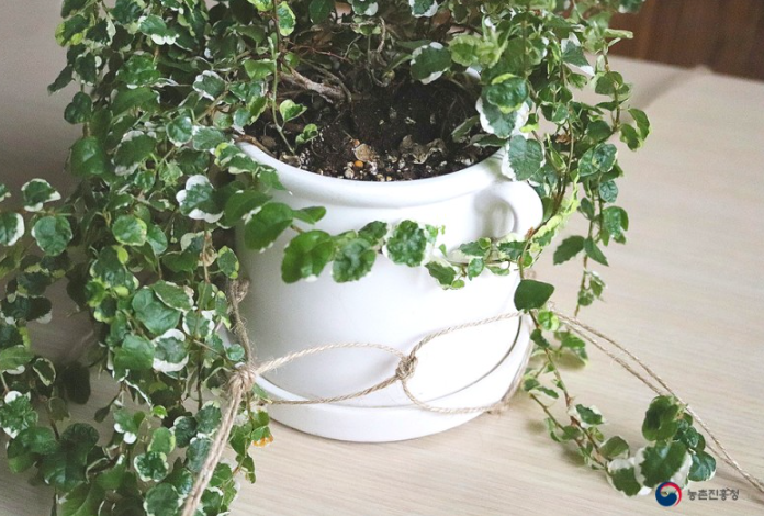 햇빛 유무와 관계없이 물만 주어도 쑥쑥 자라 가지들이 바닥에 껶여 U자 모양으로 자라고 있습니다. 아래로 쭉 뻗을 수 있도록 공중걸이를 만들어 보겠습니다.