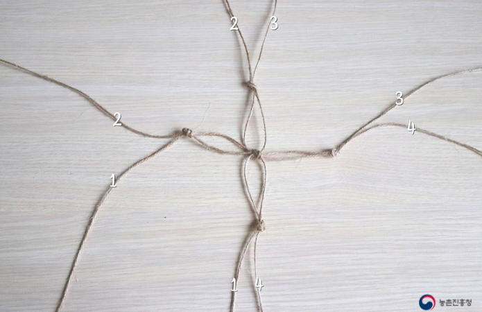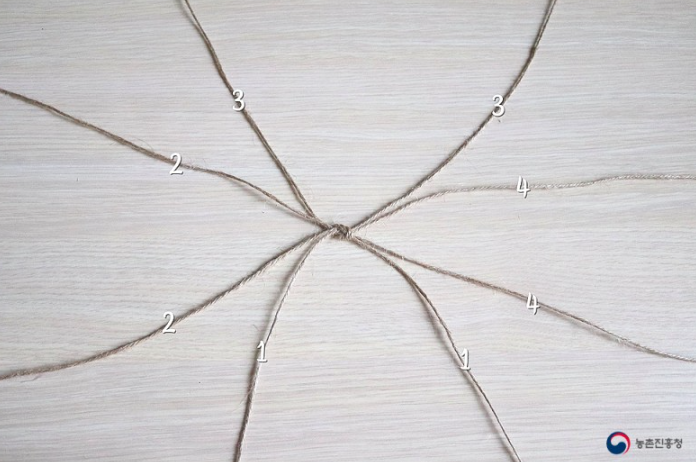 4. 총 4개로 묶어진 끈을 넓게 펼치고 같은 숫자낄 다시 합쳐 묶어줍니다.