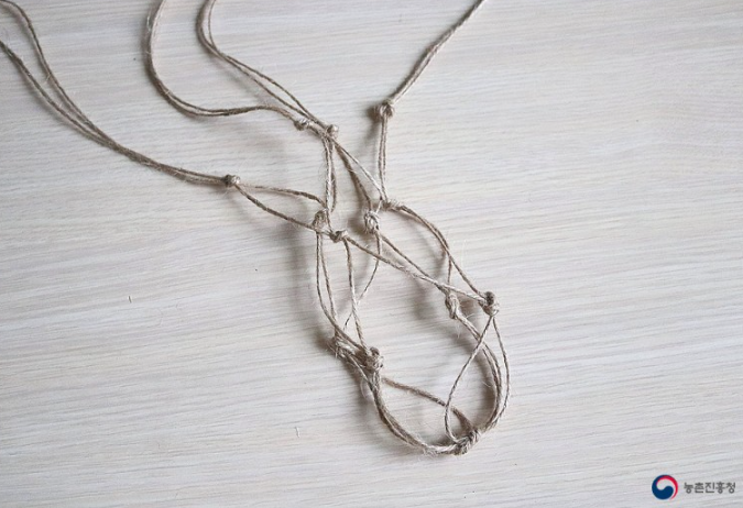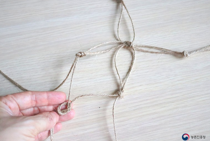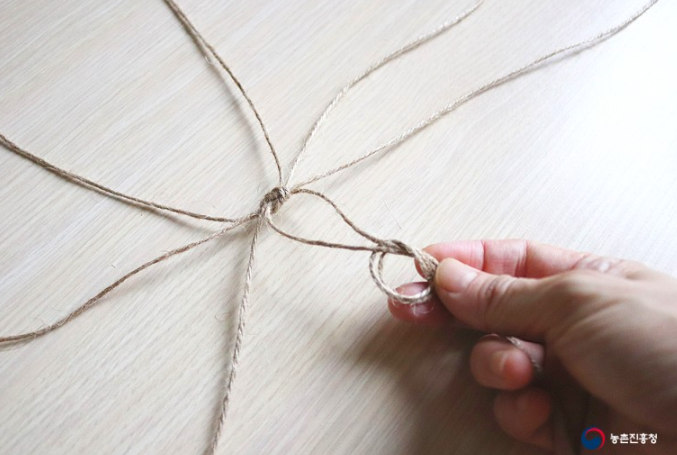 7. 가운데 매듭을 제외하고, 총 3번을 묶어 화분 공중걸이를 완성합니다.