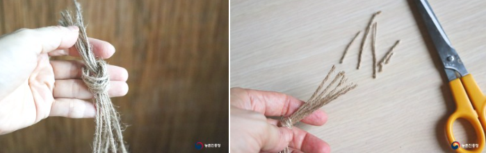 2. 가운데 매듭을 중심으로 길게 늘어진 끈을 가닥가닥 펼쳐주고 같은 숫자 끈기리 합쳐 묶어줍니다.