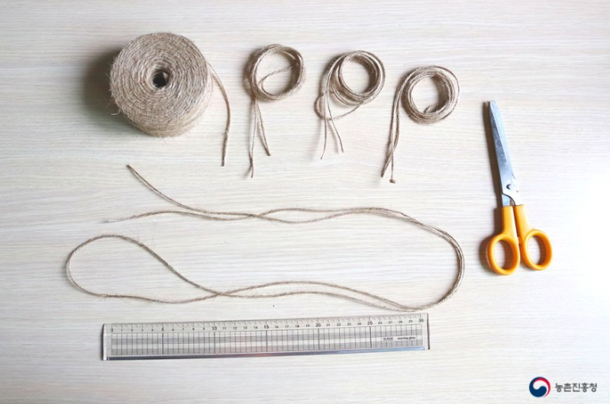 ※ 마끈은 식물이나 화분 크기에 비례해 준비해 줍니다. 푸미라를 담고 있는 화분 크기가 지름 13cm에 높이 10cm여서, 대략 1m 60cm 길이를 4개씩 잘라 주었습니다.