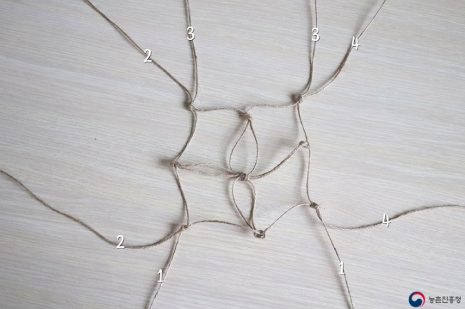 6. 엮어진 끈을 다시 넓게 펼친 다음, 같은 숫자끼리 합쳐 묶어줍니다.