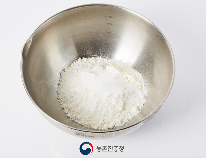 2. 찹쌀가루와 밀가루는 체에 내린 뒤 소금, 설탕을 넣고 섞어줍니다.
