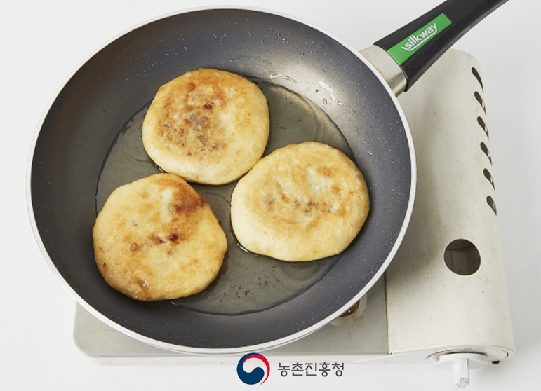 6. 식용유를 넉넉히 두른 팬을 중간 불로 달군 뒤 호떡 반죽을 올려 앞뒤로 노릇하게 구워 건져줍니다.
