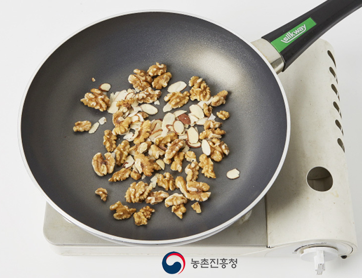 2. 호두와 아몬드 슬라이스는 마른 팬에 볶아 고소하게 만들어줍니다.
