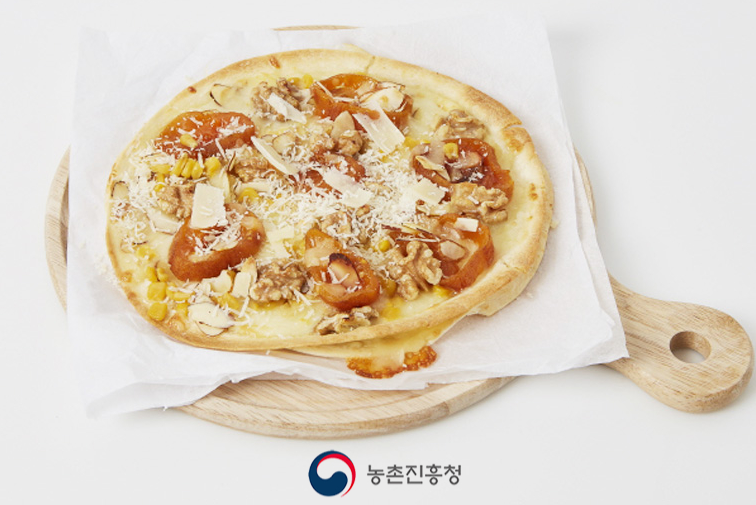 곶감 2개, 깐 호두 8개, 아몬드 슬라이스 2큰술, 토르티야 10인치 2장, 슈레드피자치즈 1컵, 옥수수 4큰술, 덩어리 파르메산치즈 1큰술 분량