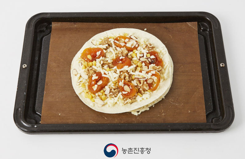 3. 토르티야 1장에 피자치즈 1/3컵을 뿌리고 남은 토르티야를 올린 뒤 곶감, 아몬드, 호두, 옥수수, 치즈를 고루 뿌려줍니다.