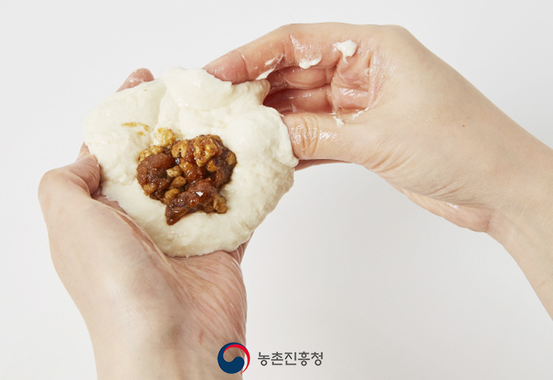 5. 숙성된 반죽을 동글 납작하게 만든 뒤 호떡소를 올려 오므려 빚어줍니다.