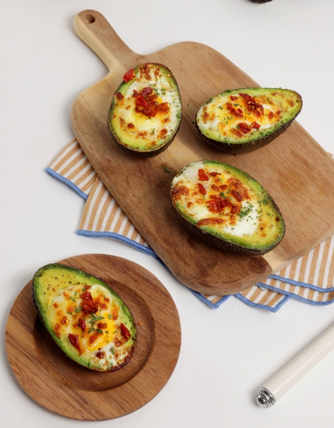 우선 잘 익은 아보카도를 베이킹 소다로 씻은 다음, 반으로 썰어 중앙에 달걀이 들어갈 정도의 크기로 과육을 파냅니다. 마요네즈 한 큰 술, 머스타드와 꿀 각각 2분의 1술을 섞어 소스도 만듭니다. 아보카도에 소금과 후추를 살짝 뿌린 뒤 소스를 발라줍니다. 과육을 파낸 공간에 달걀을 깨서 넣고 모짜렐라 치즈를 뿌린 후 예열된 에어프라이어에 180℃로 15분간 굽습니다. 마무리로 페페론치노와 파슬리 가루를 뿌립니다. 연어, 새우 등 취향에 따라 좋아하는 재료를 추가하는 것도 방법입니다.