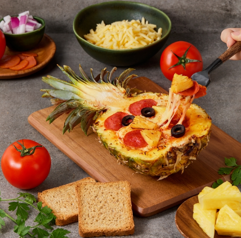레시피는 간단합니다. 파인애플을 세로 방향으로 2등분한 뒤 먹기 좋은 크기로 과육에 칼집을 냅니다. 그 위에 토마토 소스와 올리브, 페퍼로니, 모짜렐라 치즈 등을 올립니다. 예열된 에어프라이어에 180℃로 15분간 구워줍니다. 포크로 떠서 크래커나 빵에 곁들여 먹으면 됩니다.