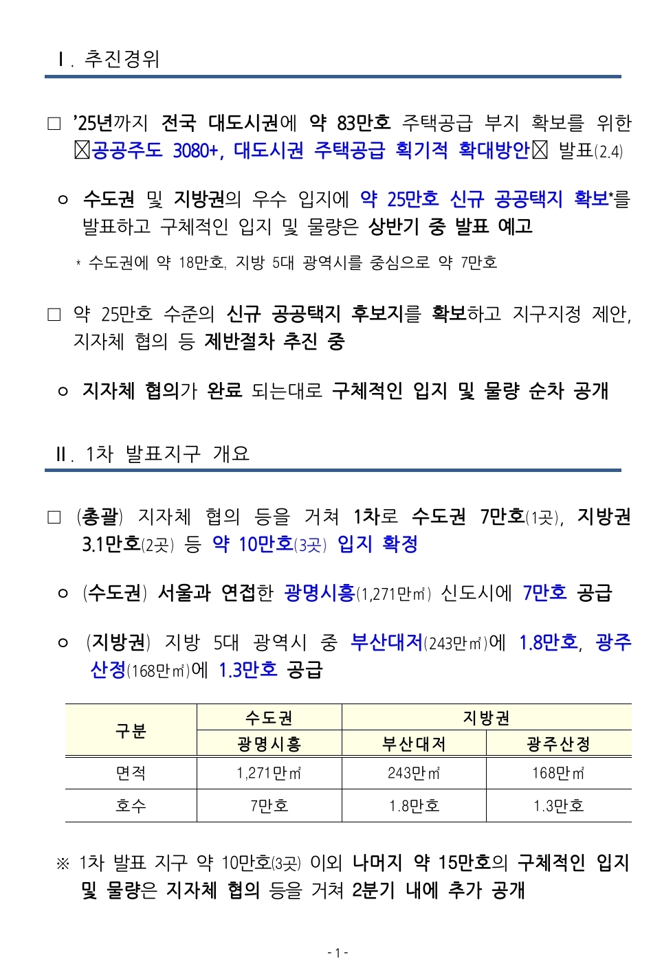 대도시권 주택공급 확대를 위한 신규 공공택지 추진계획