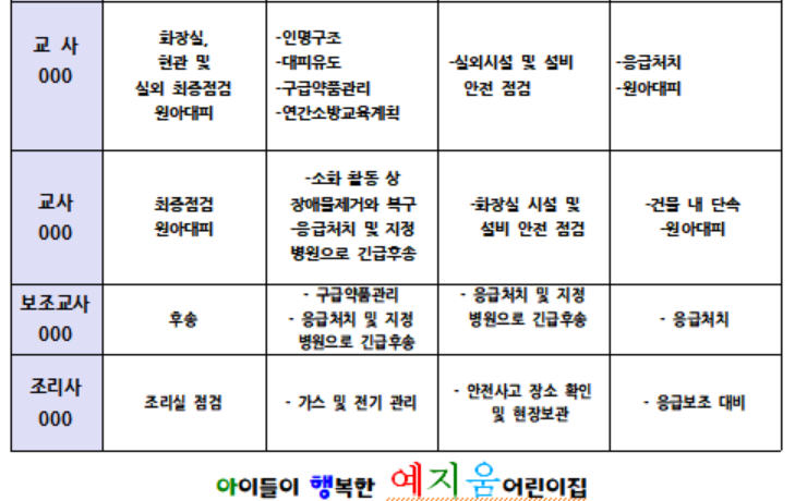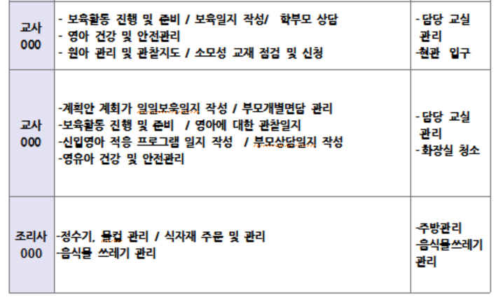 보육교사 교실에 비치해두어야 할 자료중 하나인 교사업무 분장표와 비상시 업무분담표를 올려봅니다.