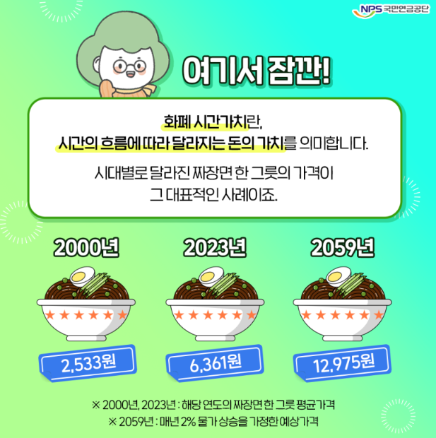 예를 들어, 현재 화폐가치 기준으로 예상연금액이 107만 원이라면, 화폐시간 가치 조회서비스를 통해 국민연금을 받게 될 36년 후의 예상연금액이 얼마인지 미리 조회해 볼 수 있는 것입니다.