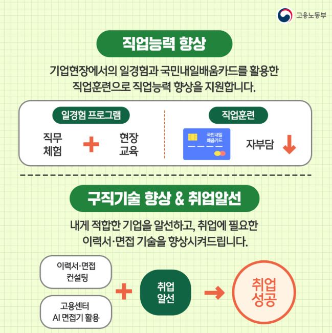 기업현장에서의 일경험과 국민내일배움카드를 활용한 직업훈련으로 직업능력 향상을 지원합니다.