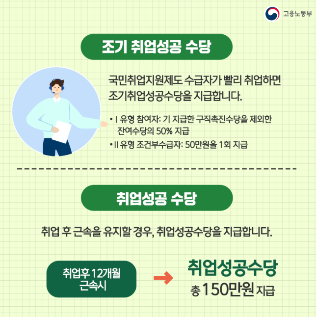 국민취업지원제도 수급자가 빨리 취업하면 조기취업성공수당을 지급합니다.