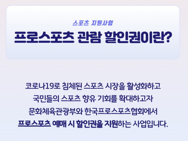 한국프로스포츠협회는 프로스포츠 구단, 티켓링크, 인터파크와 함께 프로스포츠 관람권을 지원하는 사업을 하고 있습니다. 이 사업은 문화소비와 여가활동 재개 및 내수 활성화를 돕기 위한 소비쿠폰의 일환으로서, 코로나19로 침체된 스포츠 시장의 활성화 그리고 위축된 국민스포츠 향유 기회를 확대하고자 전 국민에게 문화체육관광부와 한국프로스포츠협회에서 지원하고 있습니다.