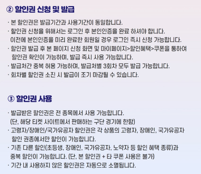 · 할인권 발급 후 본 페이지 신청 화면 및 마이페이지 → 할인 혜택 → 쿠폰을 통하여 할인권 확인이 가능하며, 발급 즉시 사용 가능합니다.
