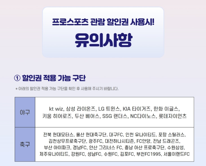 프로스포츠 관람 할인권을 사용할 때, 유의해야 할 사항들이 있습니다. 먼저, '할인권 적용이 가능한 구단'을 확인한 후, 사용해야 합니다.