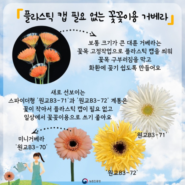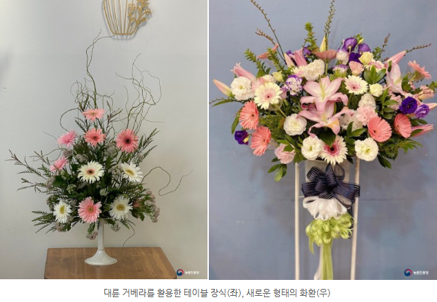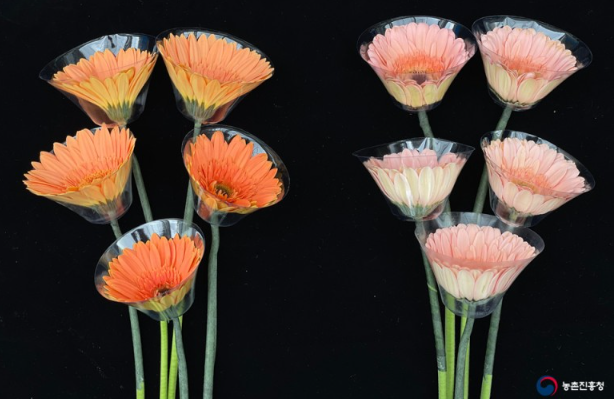 농촌진흥청은 이런 유통 경향을 반영해 개발한 화환용 거베라 대륜형 '원교B3-69'와 꽃목 고정 작업이 필요 없는 '원교B3-71', '원교B3-71' 등 20 계통을 소개했다고 합니다.