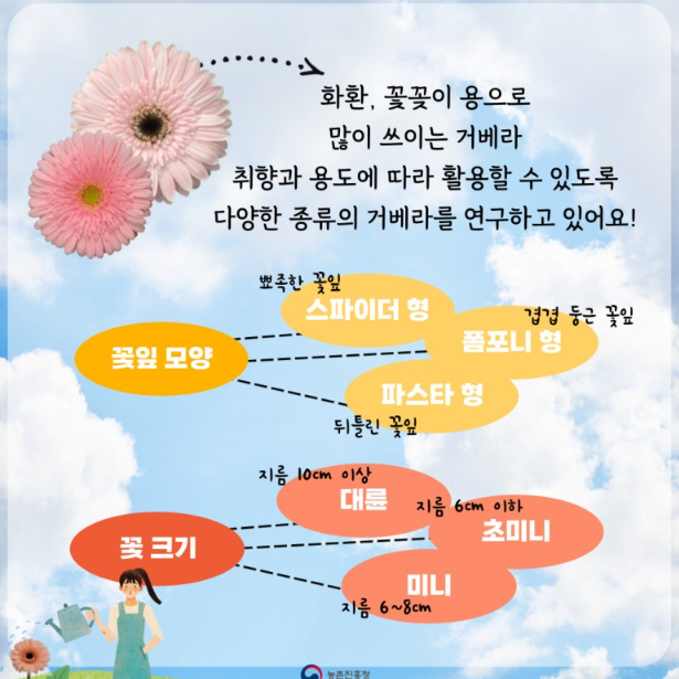 최근 거베라 시장에서는 화환용으로 적합한 꽃 지름이 10cm 이상으로 큰 꽃(대륜) 외에도 꽃잎이 뾰족한 '스파이더'를 비롯해 뒤틀린 모양의 '파스타', 겹겹이 둥글게 피는 '폼포니' 등이 유통되고 있다고 합니다.