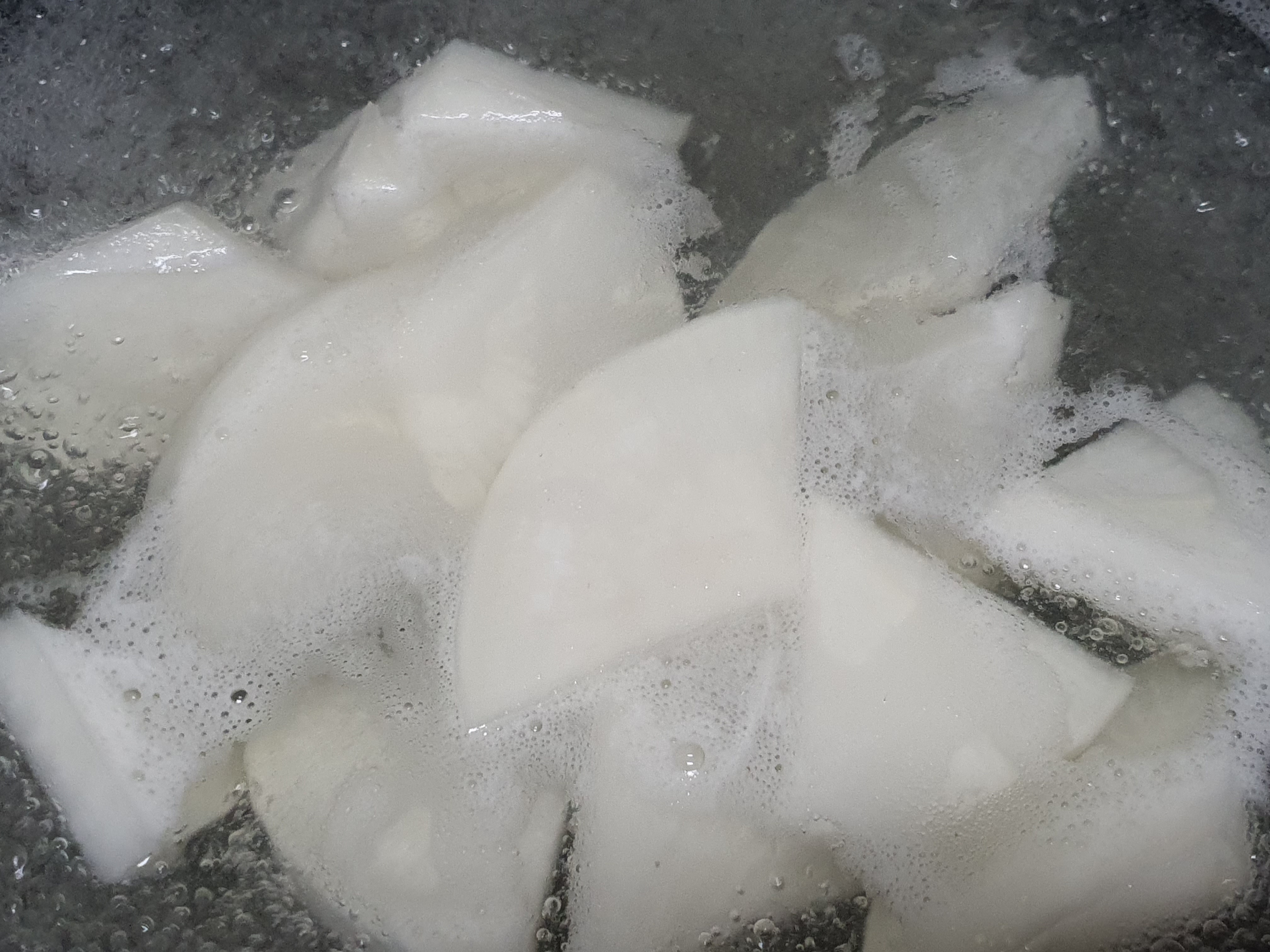 무는 끔직하게 썰어 주고 무에서 시원한 맛이 우러날 수 있도록 끓여둡니다.
