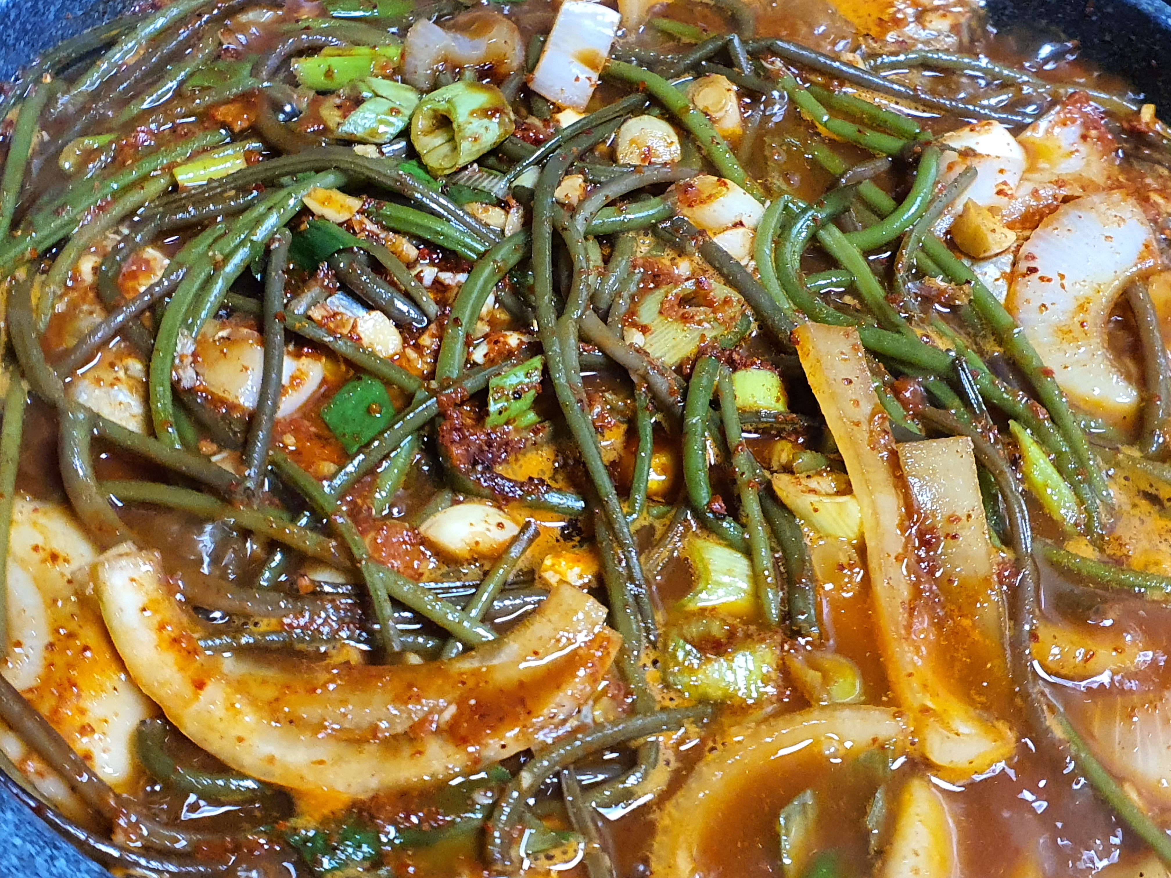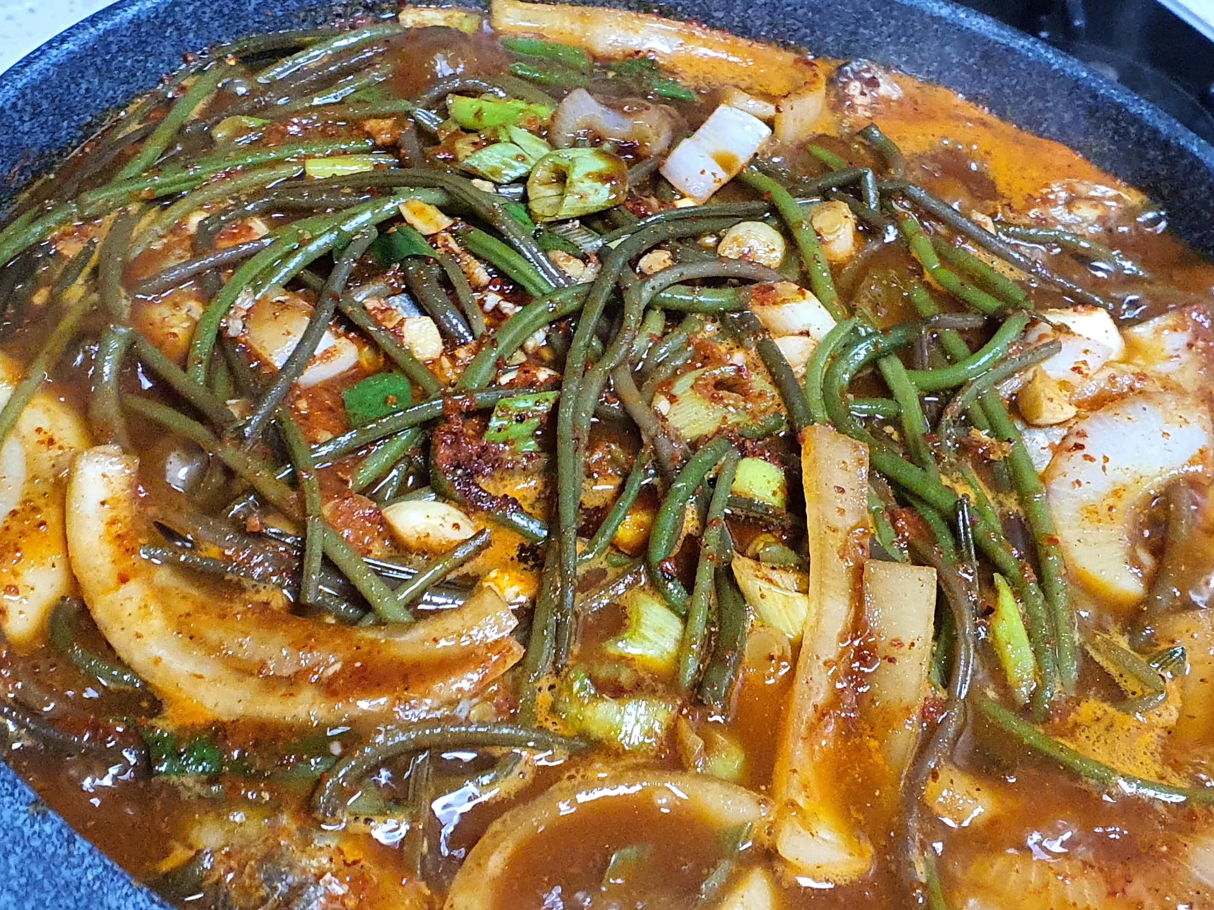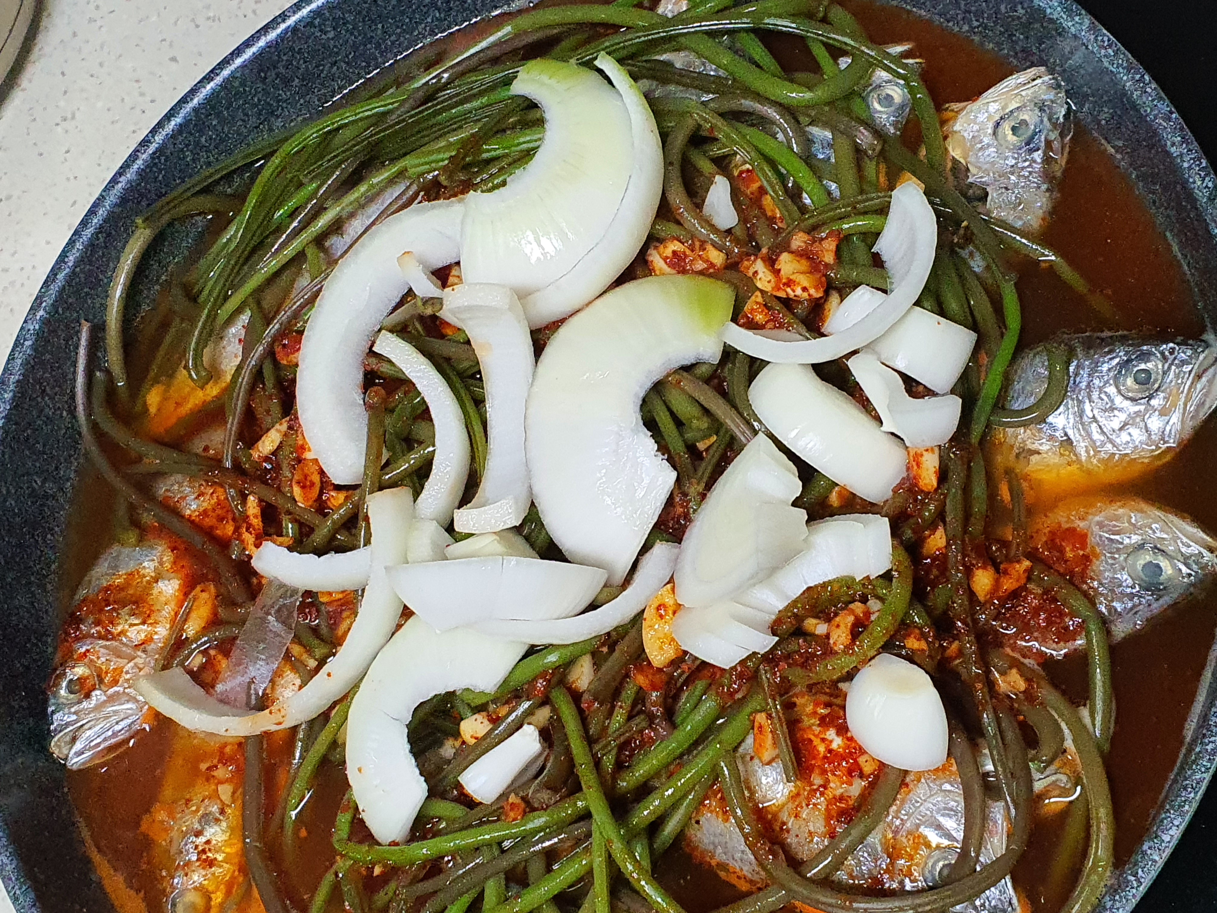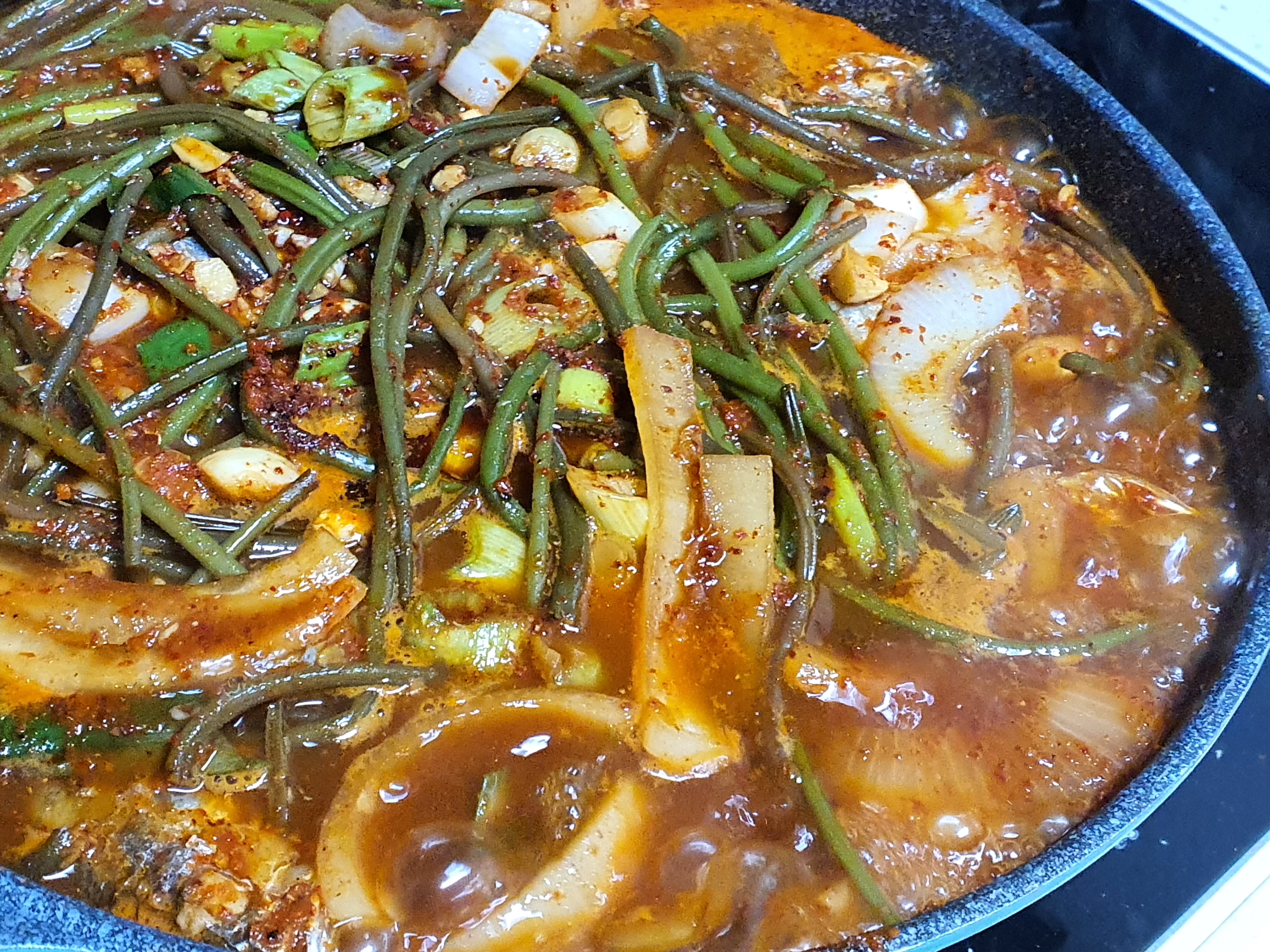 재료 : 조기 10마리, 고구마순 1봉지(고구마순은 좋아하신다면 좀 넉넉히 넣으시면 됩니다.), 양파 1개, 파 1쪽, 간장 1컵 반, 고춧가루 7스푼, 설탕 3스푼, 멸치액젖 1/3컵, 맛술 반컵, 간마늘 반컵, 후춧가루 약간, 참기름 약간, 고추, 소금