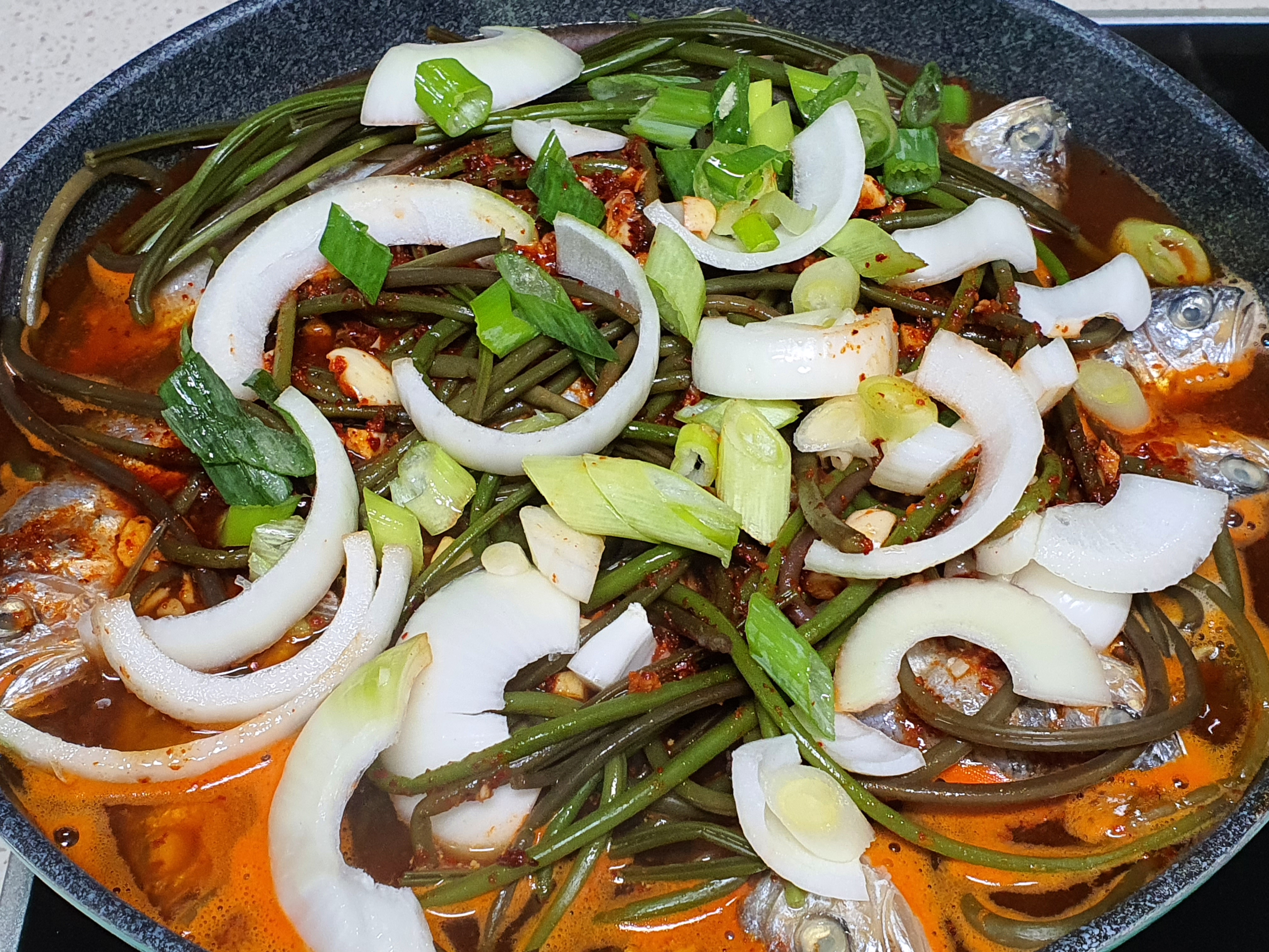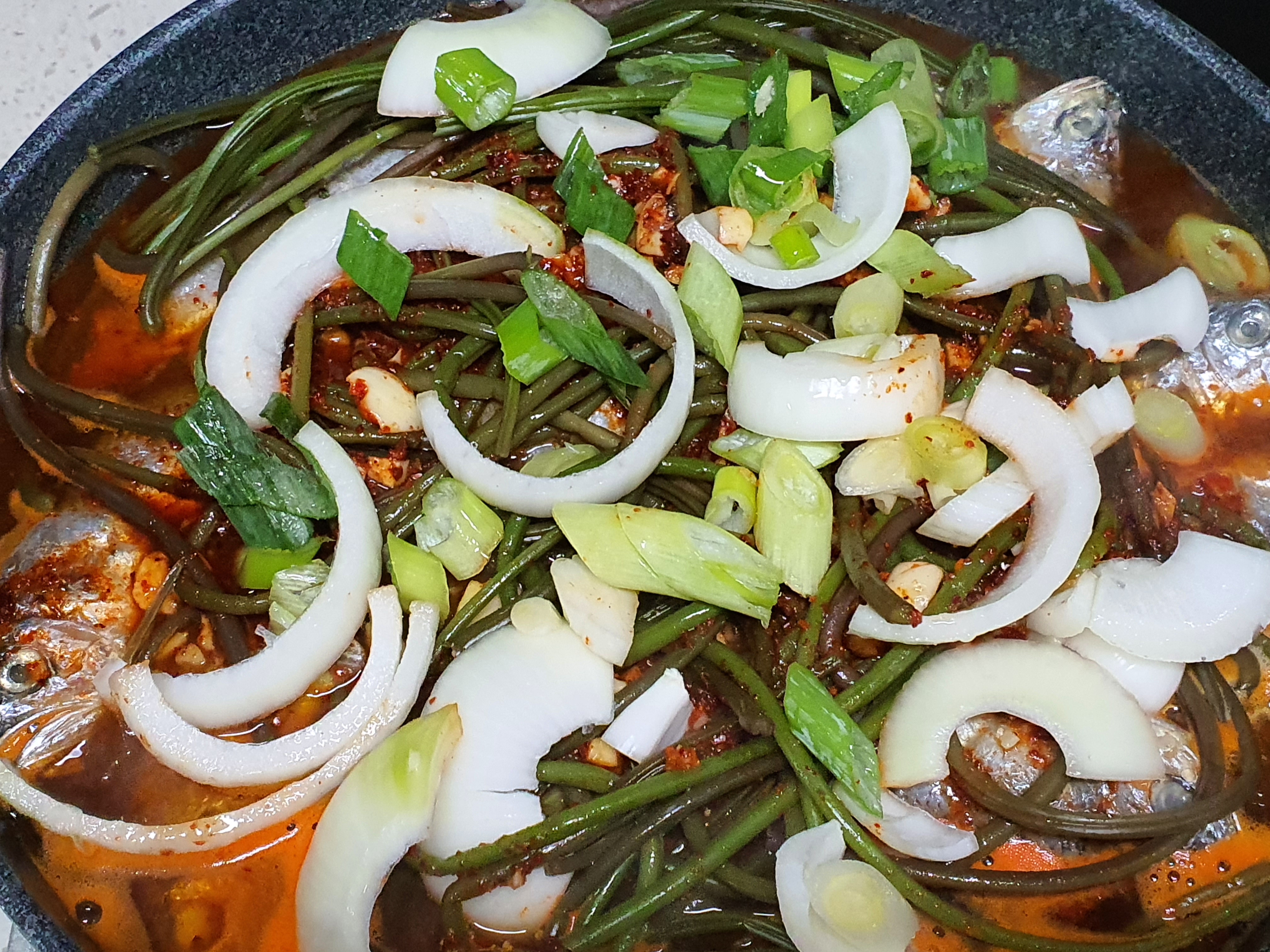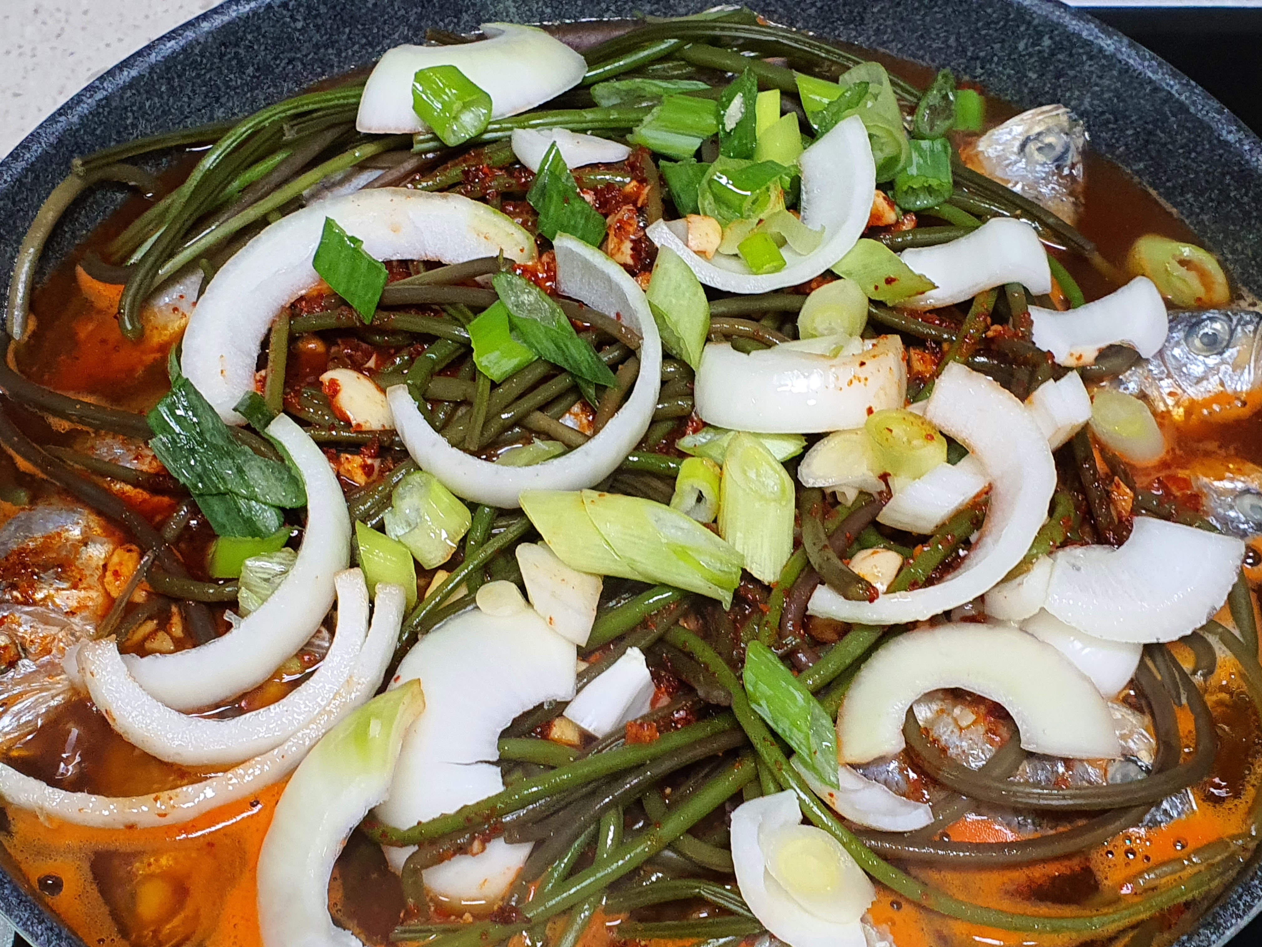 재료 : 조기 10마리, 고구마순 1봉지(고구마순은 좋아하신다면 좀 넉넉히 넣으시면 됩니다.), 양파 1개, 파 1쪽, 간장 1컵 반, 고춧가루 7스푼, 설탕 3스푼, 멸치액젖 1/3컵, 맛술 반컵, 간마늘 반컵, 후춧가루 약간, 참기름 약간, 고추, 소금