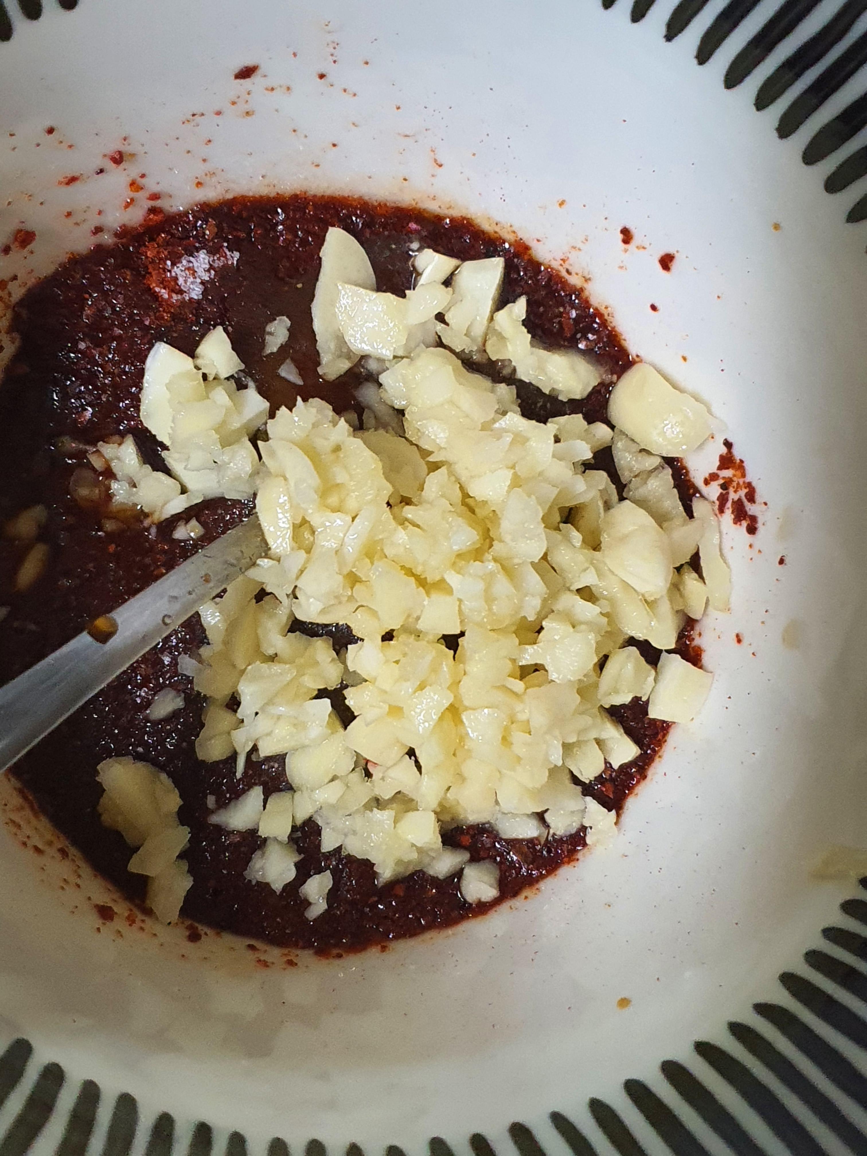 간장 1컵 반, 고춧가루 7스푼, 설탕 3스푼, 멸치액젖 1/3컵, 맛술 반컵, 다진마늘 반컵, 후춧가루 약간, 참기름 약간