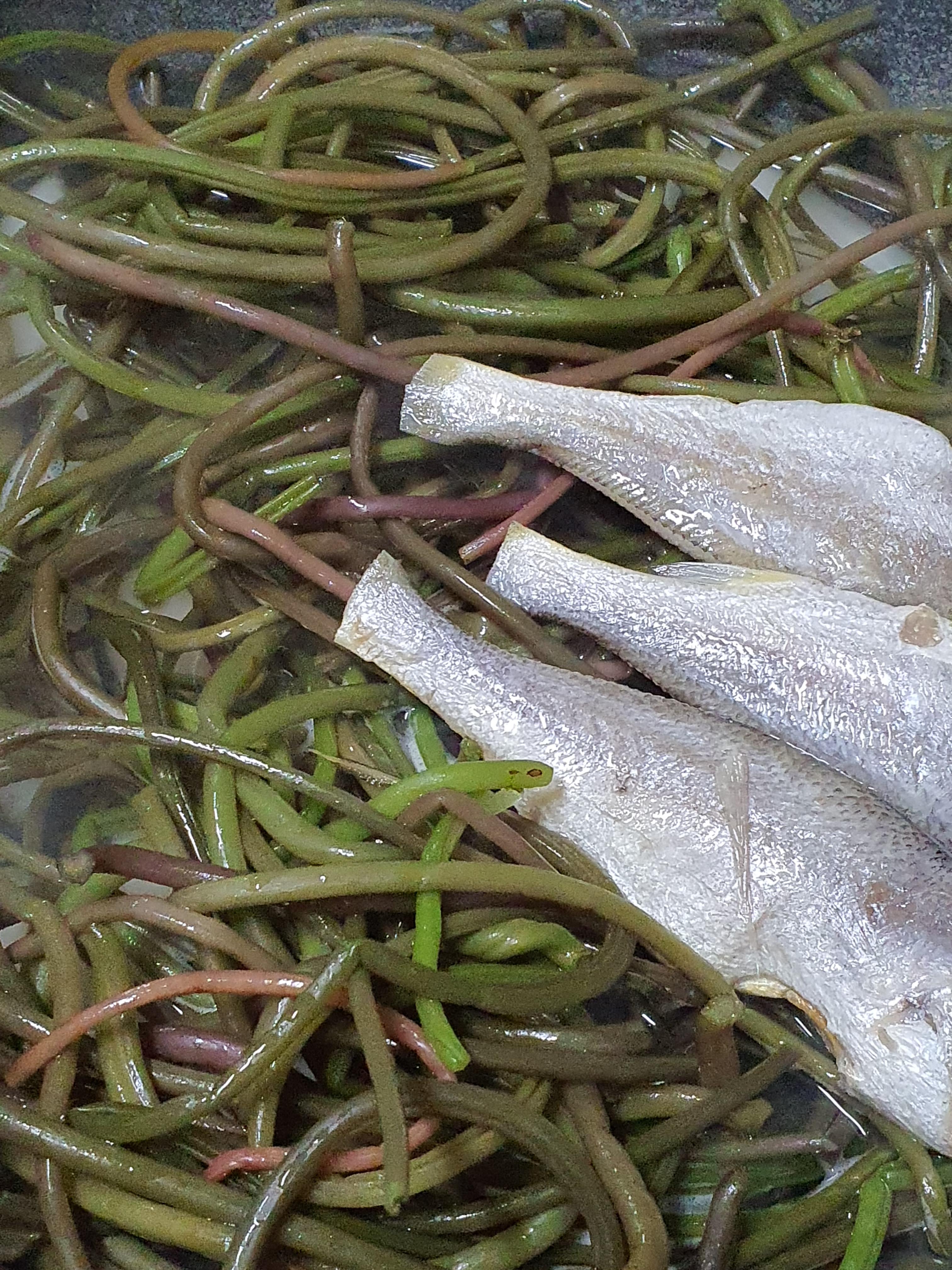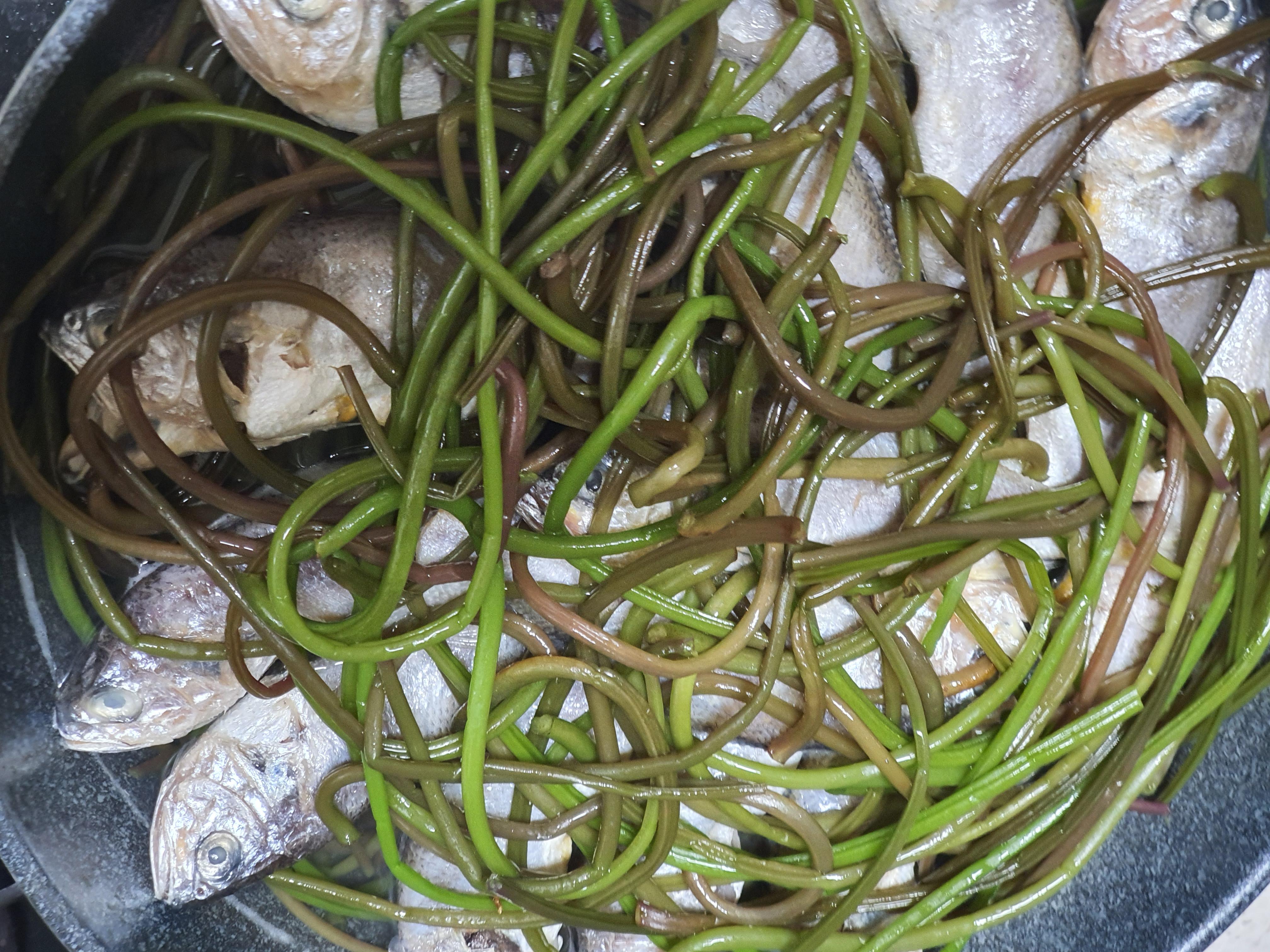 6. 요리할 그릇에 무가 깔린 육수를 넣고 고구마순을 깔고 조기깔고 다시 고구마순으로 덮어주줍니다.