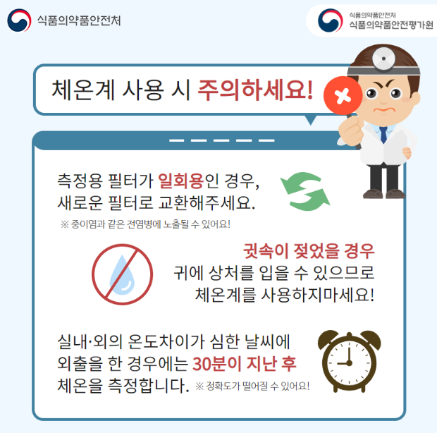 귓속이 젖었을 경우 귀에 상처가 입을 수 있으므로 체온계를 사용하지 않아야 합니다.