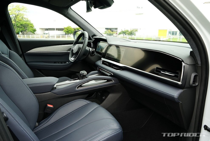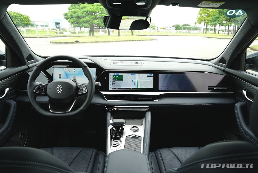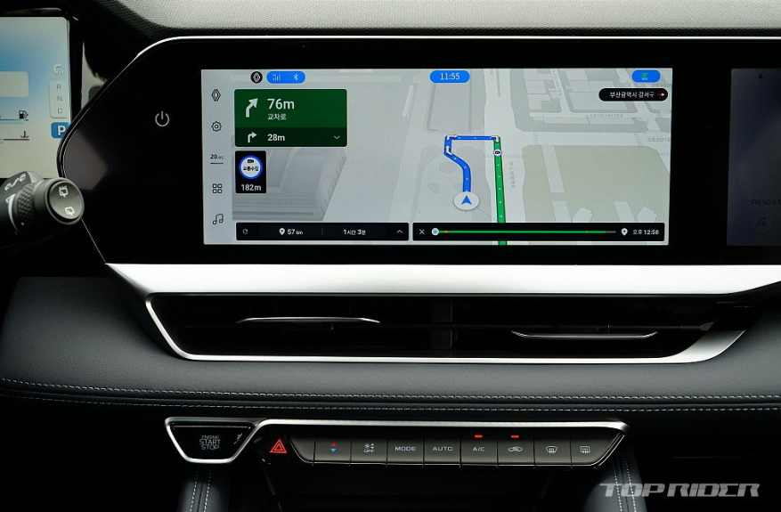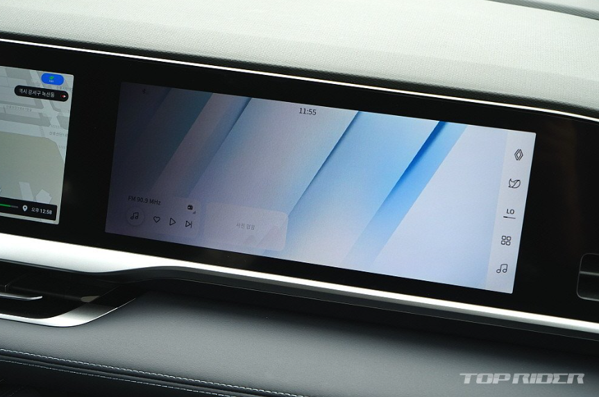 실내는 하나의 패널로 이어진 수평형 대시보드와 여기에 내장된 3개의 12.3인치 디스플레이가 분위기를 주도합니다. 주수석 디스플레이는 벤츠 E클래스에서 중상위 트림에만 적용되는 옵션으로, 국산차에 적용되는 것이 이번이 처음입니다. 편광 필름의 시야각은 다소 지나칩니다.