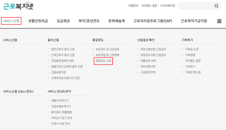 2. 「서비스신청▶휴양콘도 신청」 메뉴 클릭