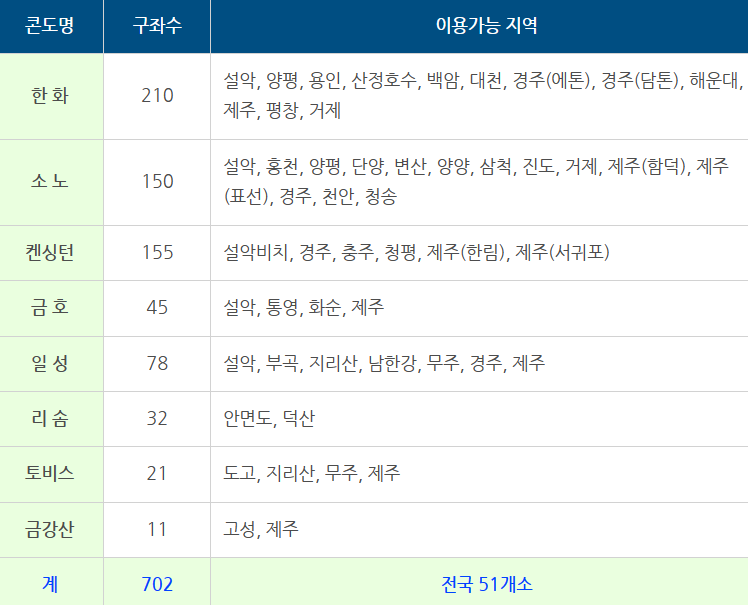 6만 원대부터 시작하는 저렴한 비용으로 한화, 대명, 리솜, 켄싱턴 등의 유명 콘도를 관광 명소 전국 51개소에서 만나실 수 있습니다.