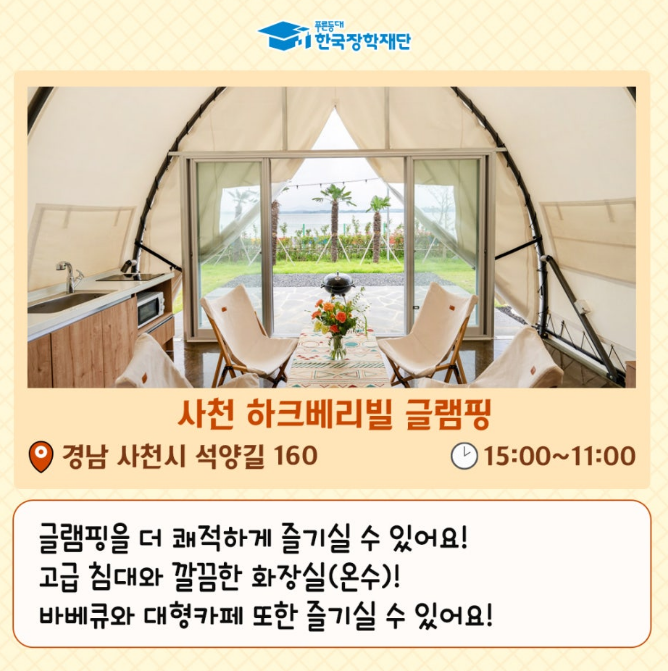 가을은 여행하기 좋은 계절입니다. 캠핑은 가고 싶지만 장비나 정보도 없어서 막막하신 분들에게 오늘 포스팅이 유용할 것 같습니다. 모두 세팅되어 있는 글램핑, 가을 국내 글램핑 4곳을 소개해 드리겠습니다.