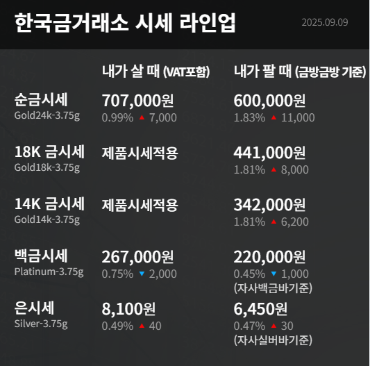 2025년 9월 9일 장마감 시세는 내가 살때 24k 기준 금값 시세는 3.75g당 전날 마감시세보다 7,000원 상승한 707,000원을 기록하고 있다고 합니다.