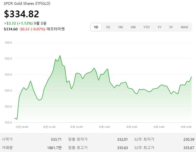 현재 금 ETF인 SPDR Gold Shares(GLD)는 약 334달러에서 거래되고 있습니다. 이는 1온스당 금 시세와 직접적인 환산은 어렵지만, ETF 움직임을 통해 시장 흐름을 엿볼 수 있는 지표입니다.