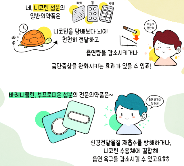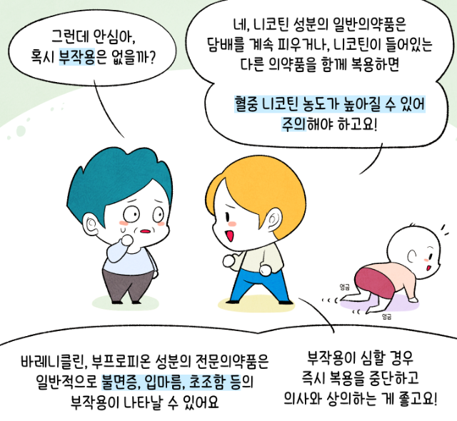반면 바레니클린, 부프로피온 성분의 전문의약품은 일반적으로 불면증, 입마름, 초조함 등의 부작용이 나타날 수 있다고 합니다.