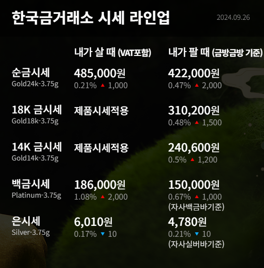 내가 팔때는 24k금시세 기준 3.75g당 전날 마감 시세보다 2,000원 상승한 422,000원을 기록하고, 18k금시세 기준 3.75g당 전날 마감 시세보다 1,500원으로 기록하며, 14k금시세 기준 3.75g당 전날 마감 시세보다 1,200원 상승한 240,600원을 기록하고 있습니다.