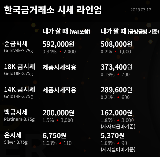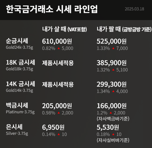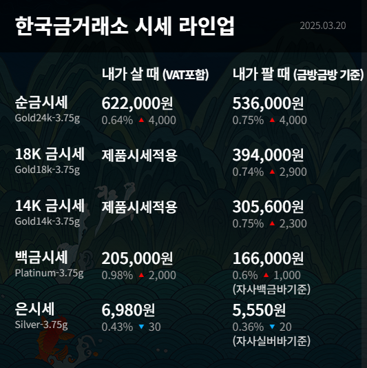 내가 팔때는 24k금시세 기준 3.75g당 전날 마감 시세보다 2,000원 상승한 422,000원을 기록하고, 18k금시세 기준 3.75g당 전날 마감 시세보다 1,500원으로 기록하며, 14k금시세 기준 3.75g당 전날 마감 시세보다 1,200원 상승한 240,600원을 기록하고 있습니다.